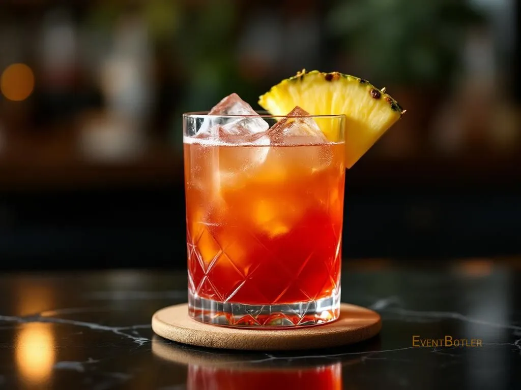 Cocktail exotique et fruité à base de rhum brun, liqueur de Campari, jus d'ananas, jus de citron vert et sirop simple. Parfait p…